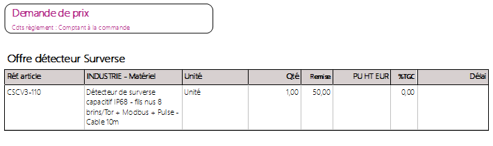 A l'impression d'une demande de prix fournisseur, nous n'avons pas de prix unitaire (case blanche) ni de total par ligne qui s'affiche (qui devrait remplacer avantageusement la colonne Délaià. Il nous faudrait au moins ces infos