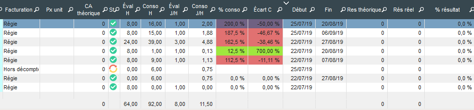 Ici screeshoot directement depuis un projet: pas de total dans %conso et Ecart C (alors que c'est intéressant d'avoir l'écart sur la totalité du projet). Dans le cas présent on devrait avoir pour % Conso le rapport 92/64 soit 143,75% en rouge, et pour Ecart C (92-64)/92 soit -30,4%