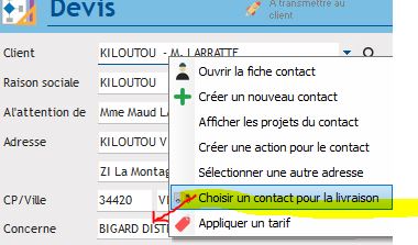Si dans cette fenetre, je fais un clic droit sur le champ client , apparait un menu où je sélectionne Choisir un autre contact pour la livraison