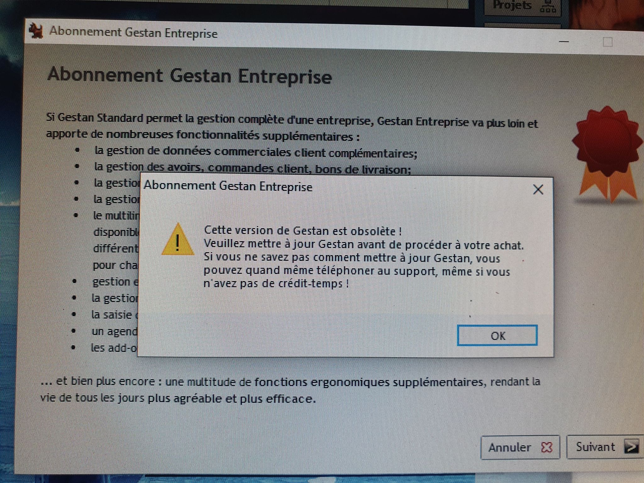 Je souhaiterai acheter la version Entreprise de Gestan or, pour cela, il me dit de mettre à jour mon application.