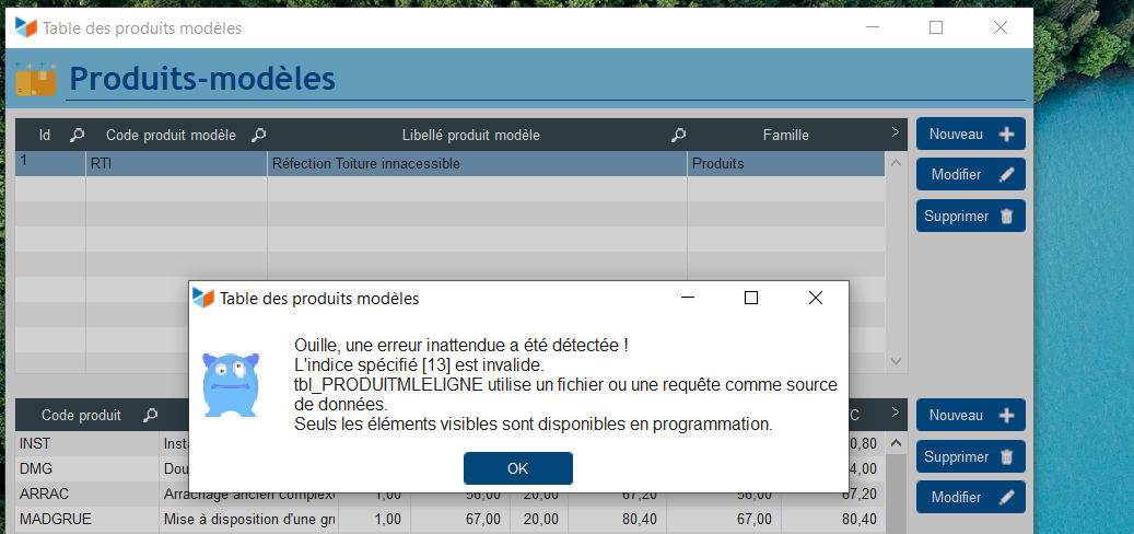 Je suis en train de tester les produits modèles et quand j'importe des lignes de produits pour construire mon modèle, j'ai ce message d'erreur.