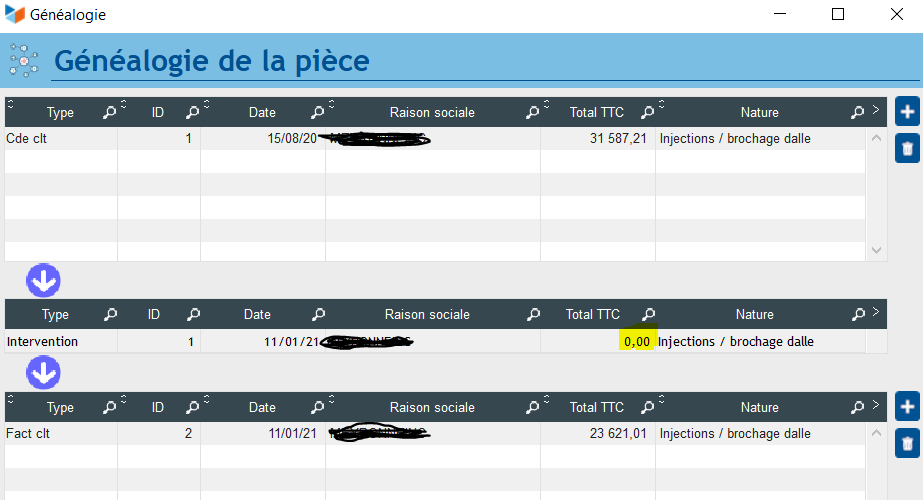 3) dans Généalogie, je pourrais faire un contrôle visuel pour savoir si le montant total des interventions est égal au montant total des commandes et des factures mais le montant TOTAL TTC reste à 0 alors que j'ai une intervention avec des ingrédients pour un montant total de 19684 HT (pour cet exemple)