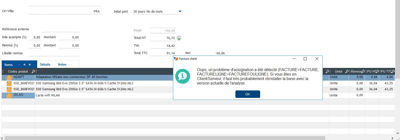Nous possédons Gestan en C/S sur 5 postes et depuis plusieurs jours, nous avons des erreurs à répétitions lors de la saisie de factures client et fournisseur avec ce message ci-dessous au moment où nous la validons en cliquant sur OK.