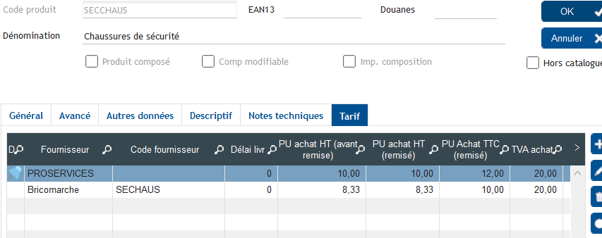 1) j'ai paramétré plusieurs tarifs fournisseur pour un produit et j'ai choisi PROSERVICES comme fournisseur par défaut