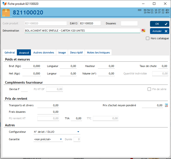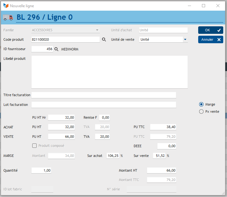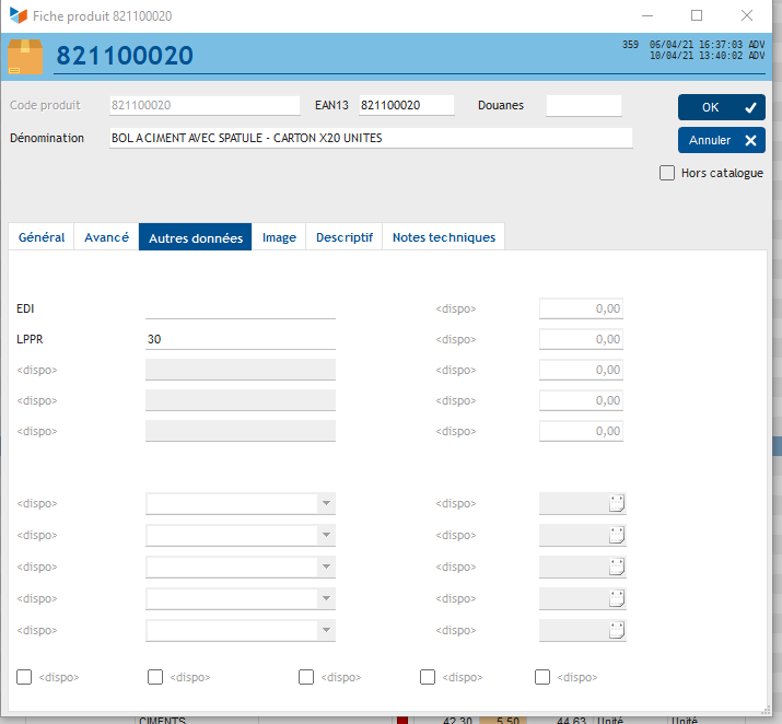 si je double clique sur mon code produit, s'ouvre la fenêtre suivante (notez le numéro de ligne, qui m'étonne, car il y a d'autres lignes dans ce devis).