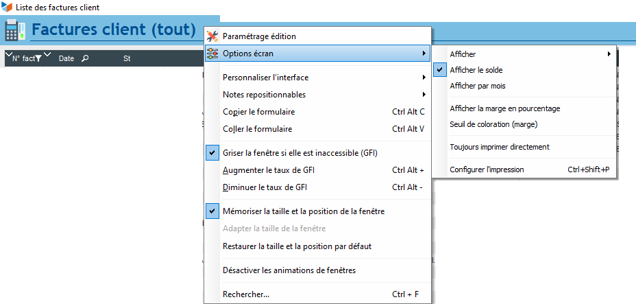 le menu contextuel collé ci-dessus est issu de l'écran liste de facture : en cliquant soit sur l'entête soit sur la grille (??!! "Table" ?)