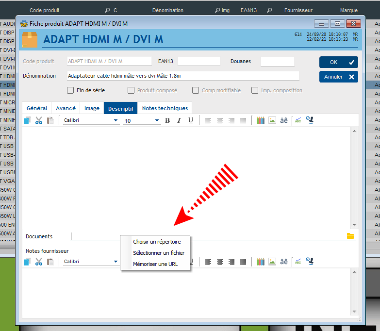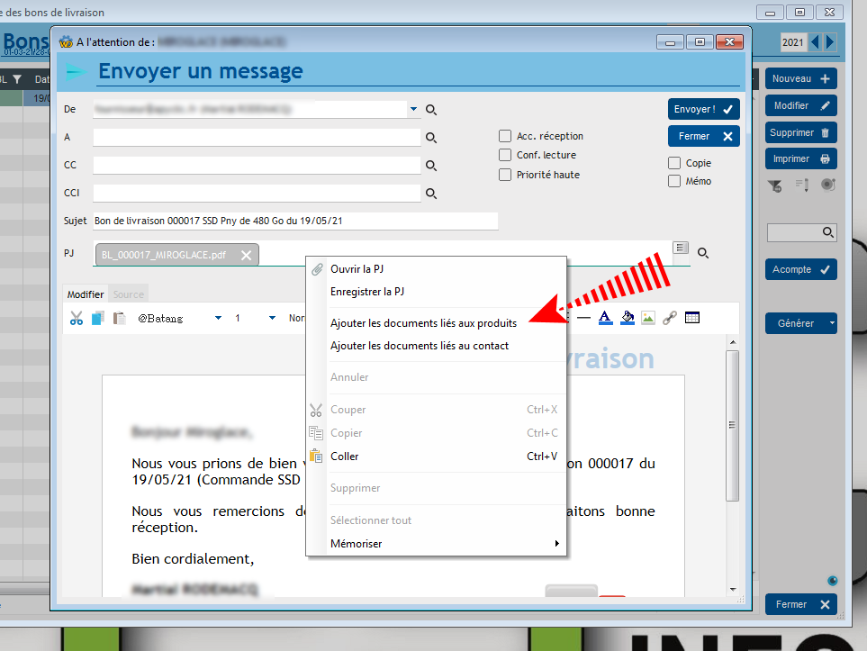 Ensuite, depuis l'écran d'envoi de mail, vous pouvez ajouter en un clic les documents liés au produit.
