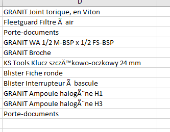 Concernant le pb d'encodage de caractères, cela vient du fichier .CVS de notre fournisseur : (Voici la partie désignation à l'écran)
