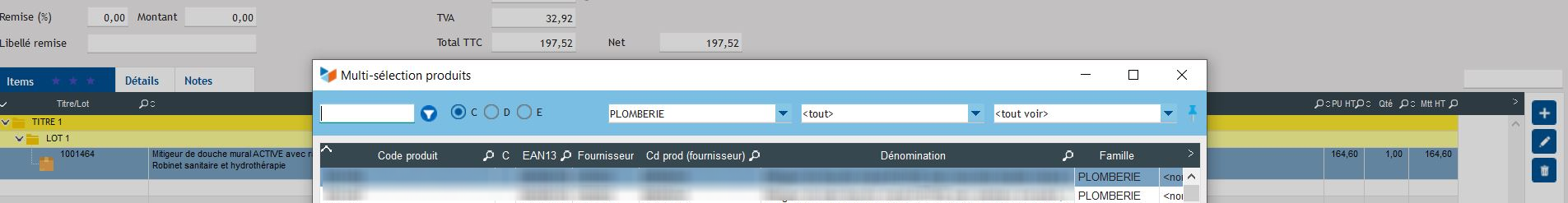 Quand je clique à nouveau sur +, il ne me propose plus cette fenetre Titre / lot mais celle ci (multiselection produits)