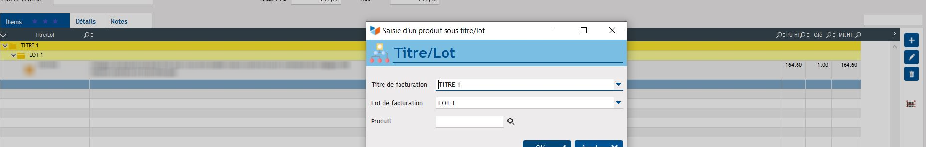 Quand je n'ai aucune ligne dans la facture et que je clique sur + (à droite) pour ajouter, j'ai bien la fenetre qui me propose de saisir/choisir Titre et Lot et code produit.