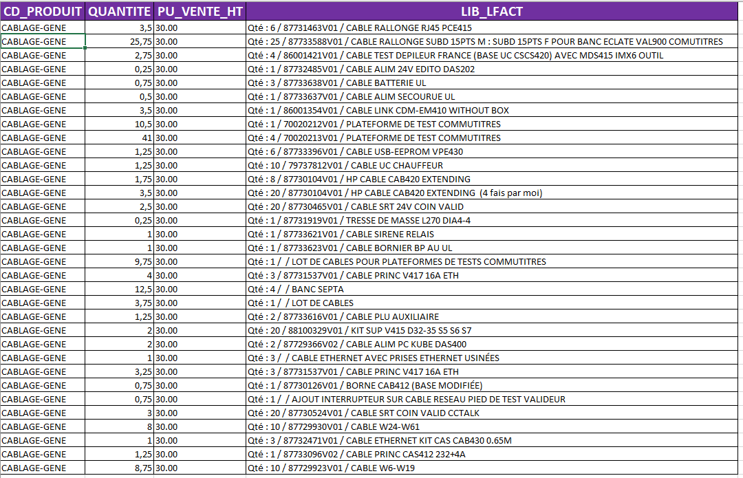 Après les autre contenue pour moi doivent pouvoir contenir, n'importe quelle donnée a partir du moment ou il correspond a la colonne (Ex : Quantité = nombre ou des heures type 20,5 ou pour le PU_VENTE_HT = le taux horaire)