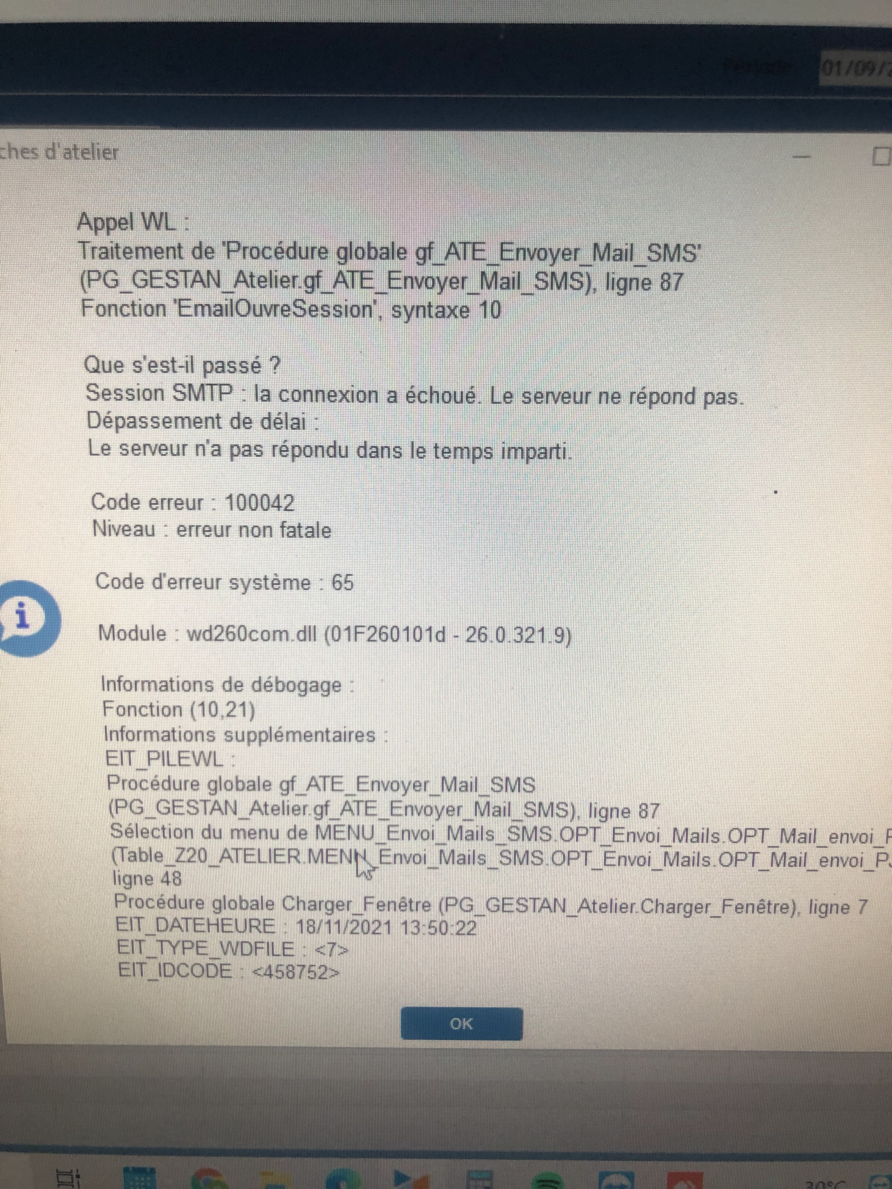 Cependant, depuis la reprise du développement, je n'arrive plus à envoyer les mails (accusé de réception, envoi des pièces jointes, bilan d'intervention, ..)