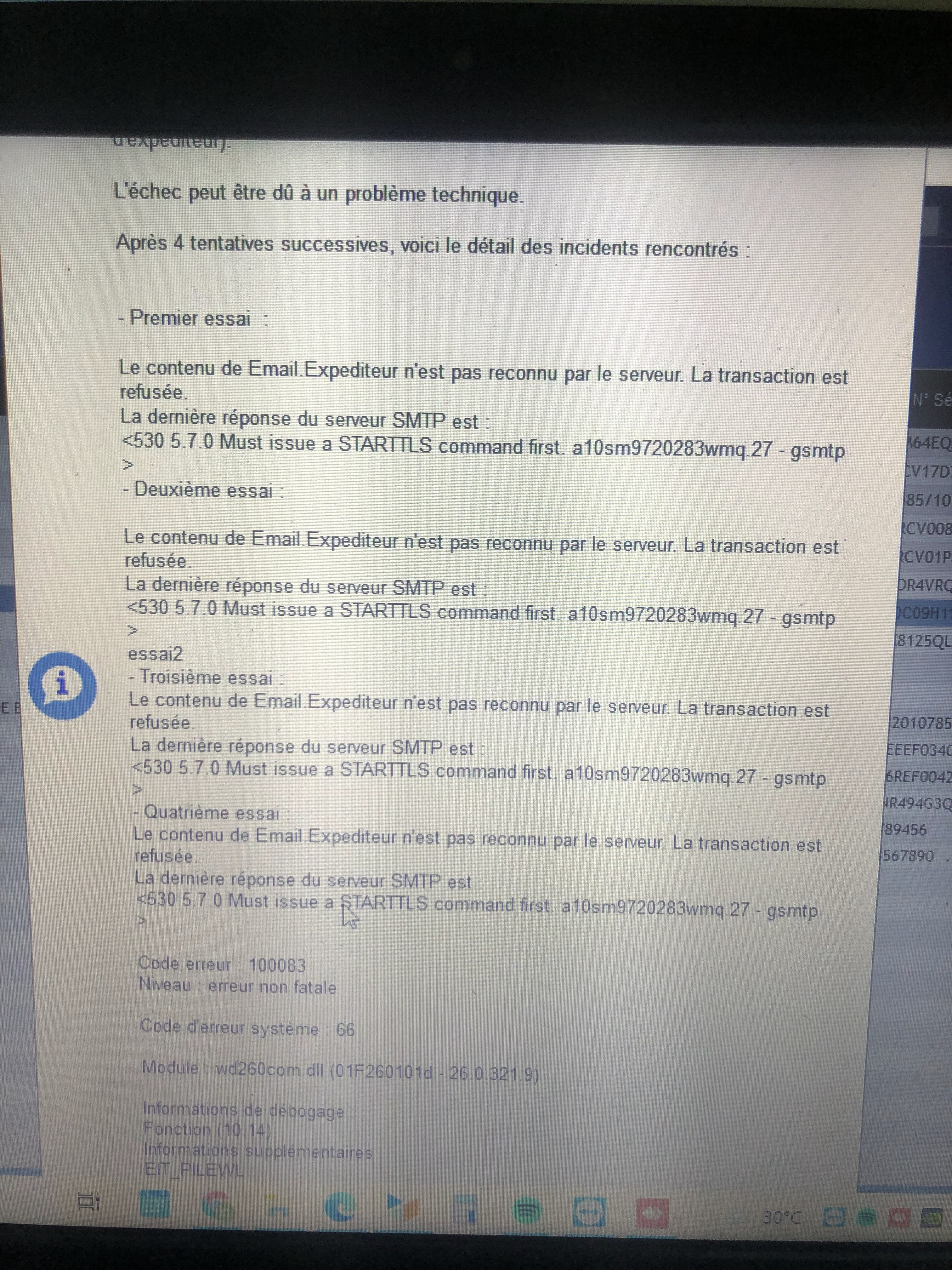 Je suis bien embêté car lorsque qu'un client me dépose un matériel, je ne peux plus lui envoyer par mail l'accusé de réception. Je ne peux non plus lui envoyer les diagnostics, bilan, ...