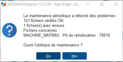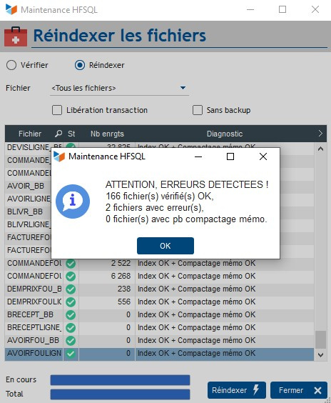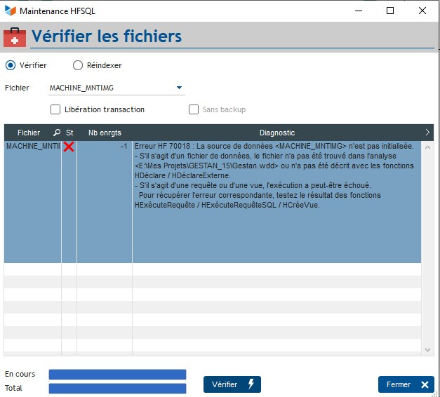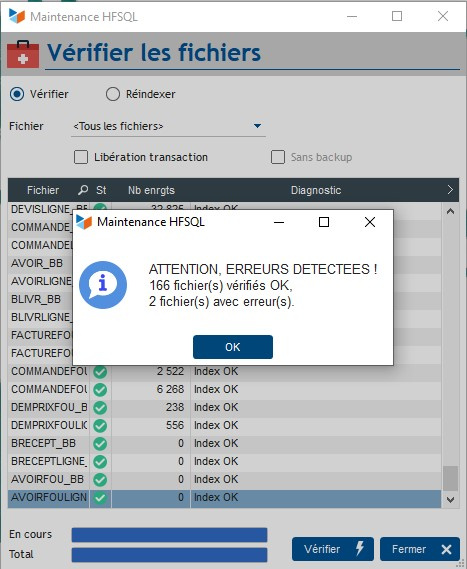 Ce matin 1er jour du mois la vérifcation et sauvegarde de l'index démarre, des erreurs sont reportées, Gestan me propose une vérification HFSQL et trouve des erreurs que la réindexation ne résout pas.