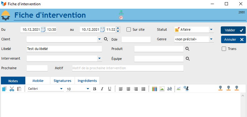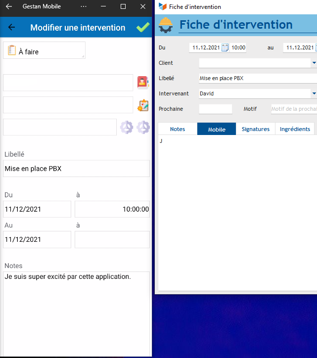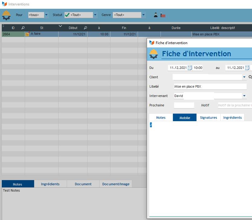 1 - Si l'on ouvre l'intervention on voit l'onglet "Mobile" alors qu'il n'est pas visible en bas du menu intervention.