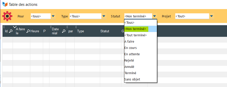 Les actions de statut A confirmer n'apparaissent pas le filtre <Non terminé> (qu'il serait plus juste d'écrire <Non terminées> vu q'on parle d'actions)