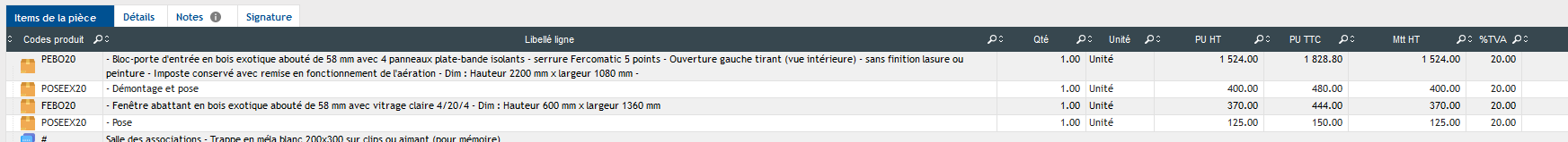 Je créé un devis avec plusieurs lignes et sur chaque ligne un article correspondant à un code comptable 704zz et à un taux de TVA 20% qui renvoi lui-même à un compte de TVA.