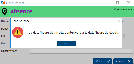 En soit, c'est logique que la date de fin soit antérieure à la date de début lors de la saisie puisque par défaut c'est la date du jour et je souhaite ajouter des congés futurs.