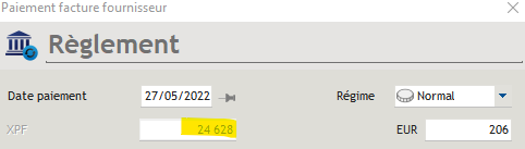 Nous avons un gros soucis car dans la fenêtre de règlement fournisseur dont ce dernier est configuré en €, il nous est impossible de rentrer le montant en XPF dont la case est grisé. Du coup nous rentrons le montant en € mais nous avons besoin des 2 décimales car la conversion € / XPF n'est pas correcte.