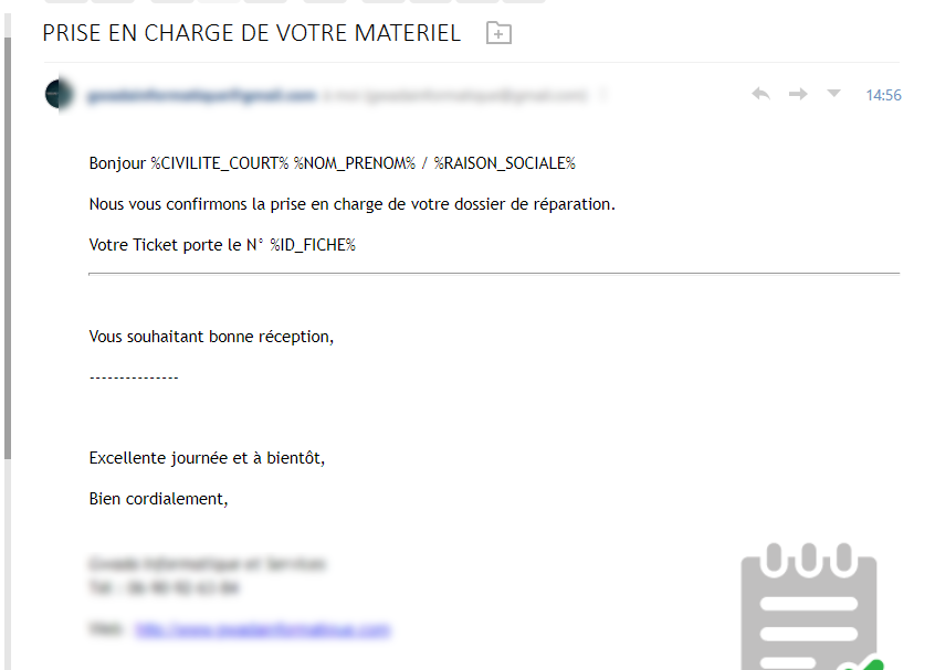 Le souci étant que lorsque j'envoie les pièces jointes au client, c'est souvent pour lui transmettre l'avancée du diagnostic. Mais là, il reçoit un 2eme mail, lui indiquant du coup que la réparation est clôturée, alors que ce n'est pas le cas..