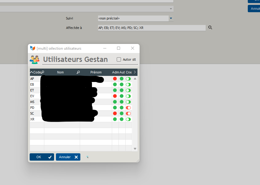 Par exemple, lorsqu'on désélectionne des utilisateurs comme ci-dessus, impossible rien n'est modifié dans la ligne "affectée à", et impossible de supprimer manuellement les utilisateurs