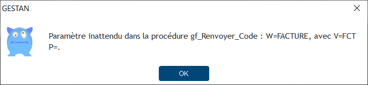 En voulant créer une facture suite à une intervention (j'ai d'ailleurs eu du mal à retrouver la fonction et je ne trouve pas que cela aille dans le sens de la simplicité...), j'observe un crash de Gestan avec le message suivant :