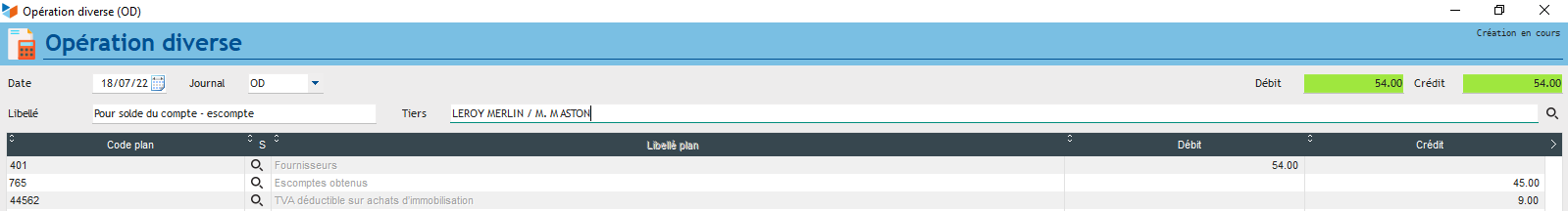 Je saisi une OD pour solder le compte du fournisseur, donc avec l'indication du tiers :