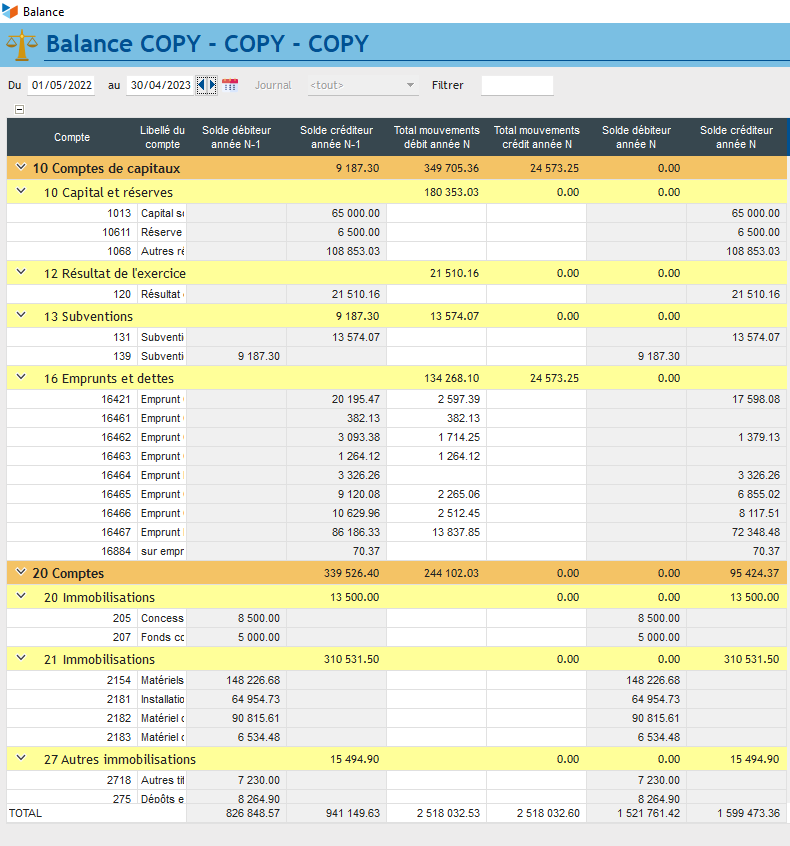 Après avoir fait la clôture de l'exercice du 01-05-2021 au 30-04-2022 et repris les à-nouveaux, j'affiche la balance :