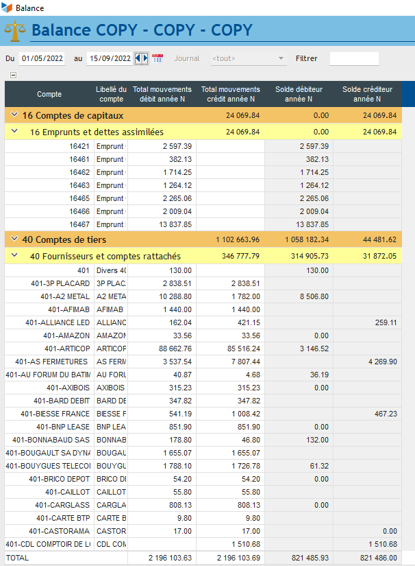 Mais compte tenu de l'avancement de mes travaux comptables, je souhaite afficher la balance de l'exercice au 15-09-2022, soit du 01-05-2022 au 15-09-2022 pour préparer une situation :