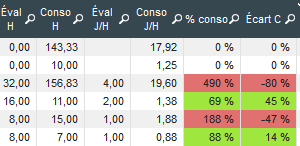 Dans la liste des tâches, on retrouve bien le % de consos de temps passé par rapport au temps prévu. C'est en vert quand c'est en dessous de 100% et en rouge au dessus, c'est à dire quand on a passé plus de temps que prévu ... là c'est OK: