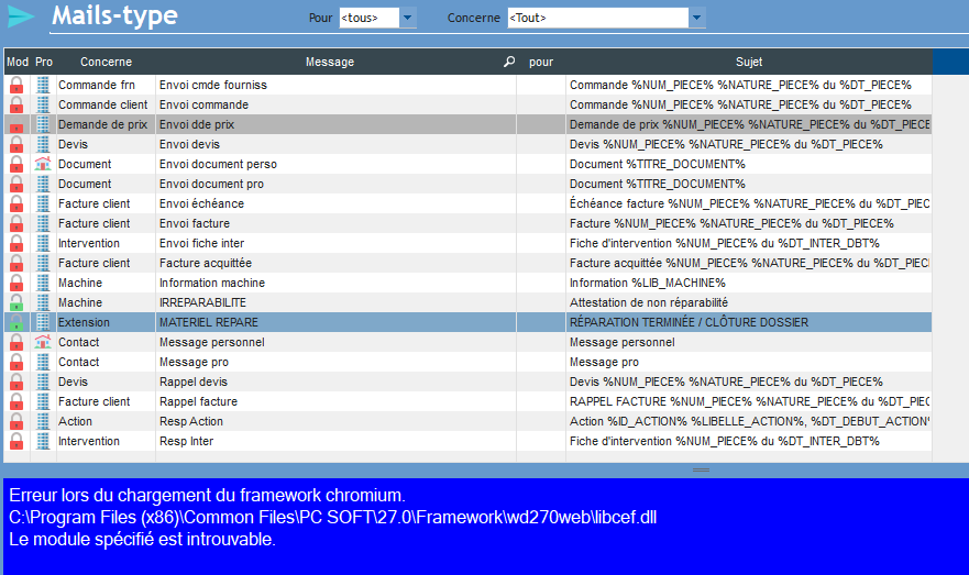 En revanche, lorsque je vais dans Entreprise>Option Utilisateur>Messages-Type, j'ai un message d'erreur en bas de la fenêtre, cela peut-être vient de là ?