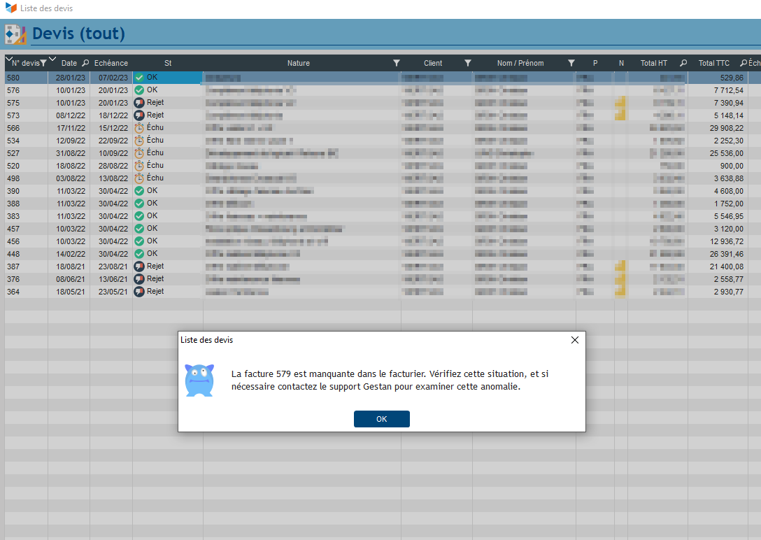 depuis plusieurs semaine, une erreur (à priori sans conséquence) s'affiche quand je transforme un devis en facture, j'ai la version 15.40.04/u-06, le message parle du numéro de facture qui est en fait le numéro qui précède le devis en cours (les factures je suis à + de 2000, vu avec Vladimir qui m'a recommandé de poster ici