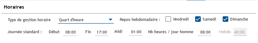 Les horaires globaux de l'entreprise sont du lundi au vendredi de 8H00 à 12H00 et de 13H00 à 17H00.