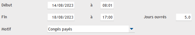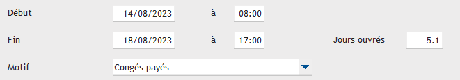 Mon employé prend une semaine de vacances, du 14.08 8H00 au 18.08 17H00, le résultat devrais donc être de 5 jours ouvrables selon le calcul fait par Gestan mais je me retrouve avec 5.1 jours ce qui n'est pas logique