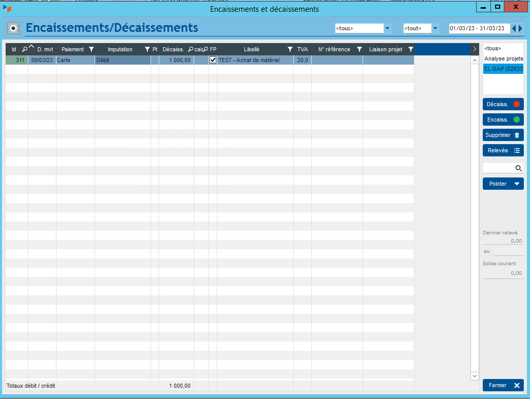 J'ai acheté du matériel chez WURTH pour un total de 1 000€, j'ai donc créer un décaissement.
