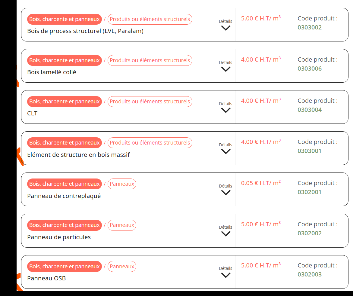 Le problème se complique lorsqu'on voit qu'il existe des différences significatives selon les matériaux d'une même famille (le bois massif, le lamellé-collé, les panneaux OSB, etc..., ont tous d'autres coefficients tarifaires. Ajoutez à cela que je vends encore de la quincaillerie, c'est le pompon!