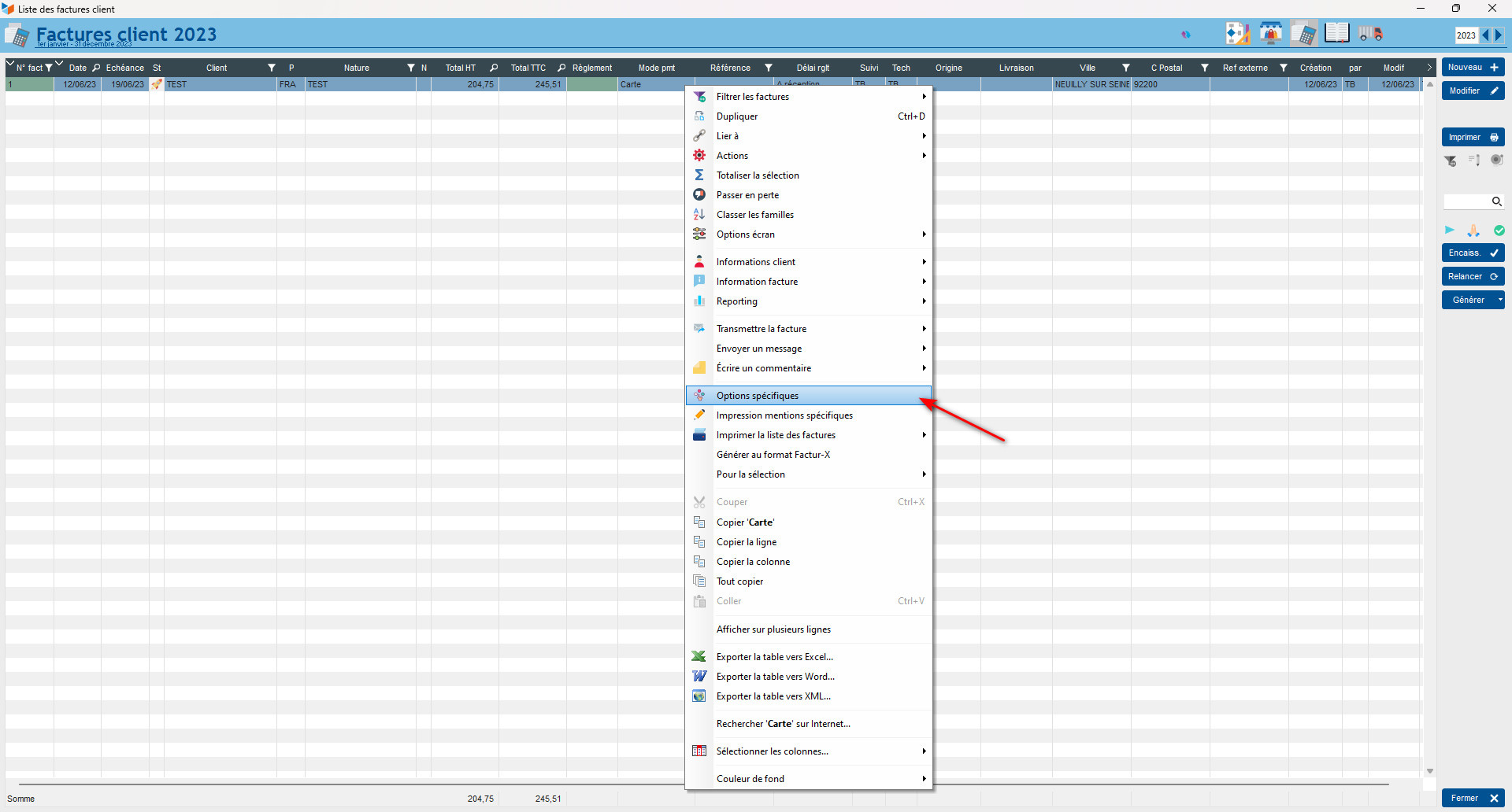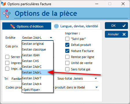 Enfin vous cliquez droit sur la facture dans la liste des factures, puis Options spécifiques puis choisir l'entête Gestan 2AdrL :