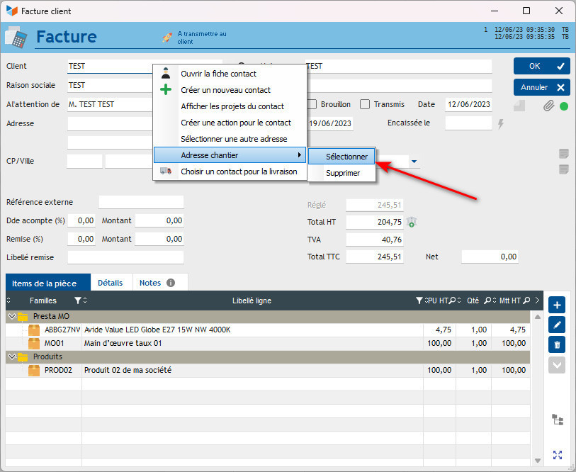 Vous ouvrez la facture en question et vous cliquez droit sur le champ Client=>Adresse chantier=>Sélectionner :