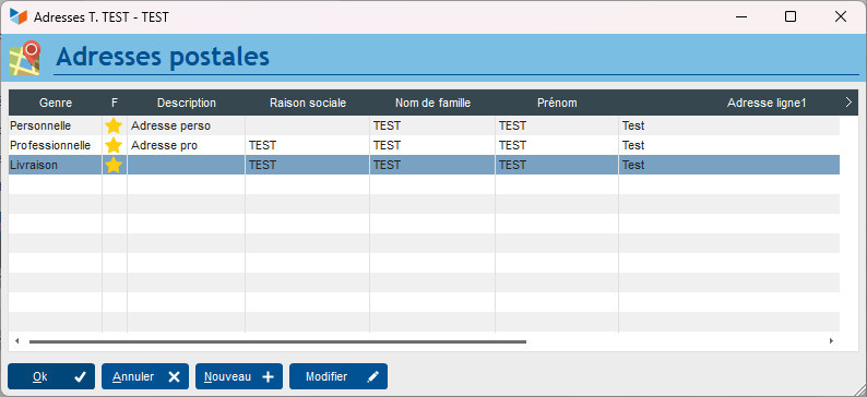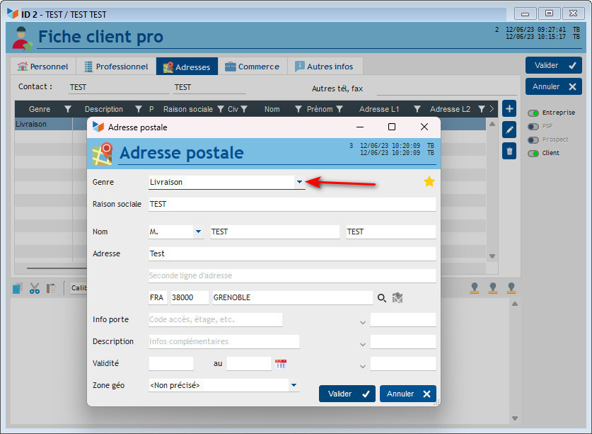 Vous entrez l'adresse de livraison en faisant bien attention à lui assigner un genre Livraison :