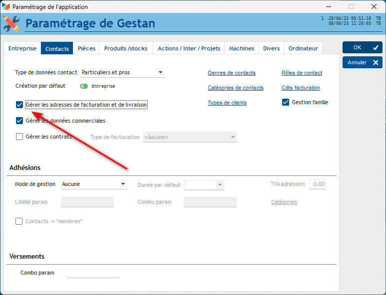 Pour ce faire, il vous faut dans un premier temps activer la gestion des adresses de livraison dans Outils=>Paramètres de l'application=>Paramètre General :