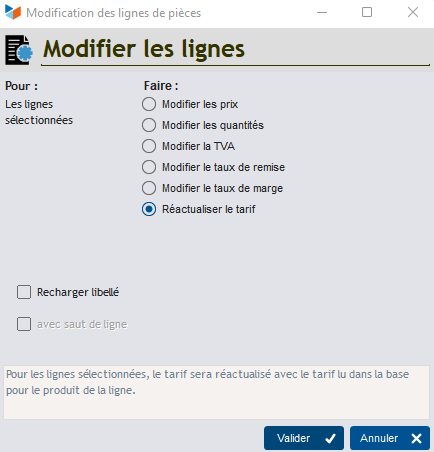 Dans les devis, lorsqu'on souhaite réactualiser les tarifs des produits (clic droit "données"; "modifier les lignes"