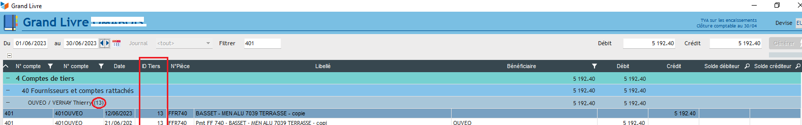 Pour l'enregistrement comptable de la facture, on a bien le compte 401OUVEO crédité, avec l'ID contact 13