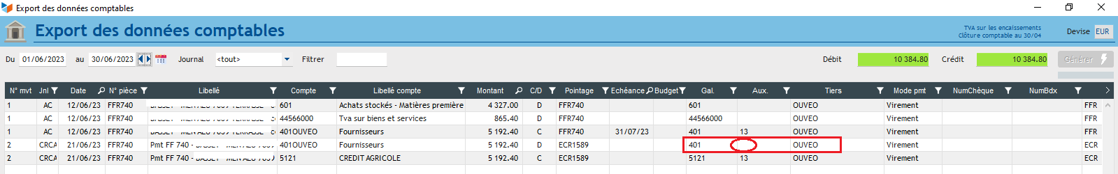 Pour l’enregistrement comptable du règlement, on a bien le compte 401OUVEO débité, il manque l'ID contact 13 pour pouvoir lettrer le mouvement dans le logiciel comptable.