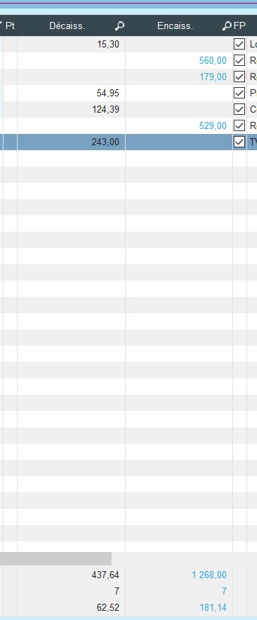 Dans la fenêtre des Ecritures (= "Encaissements/Décaissements")), j'affiche en bas de colonne les informations de Compteur et de Moyenne.