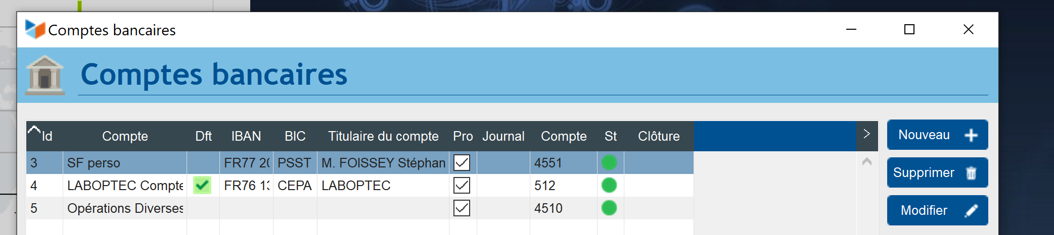 Voici mes paramétrage de comptes bancaires :