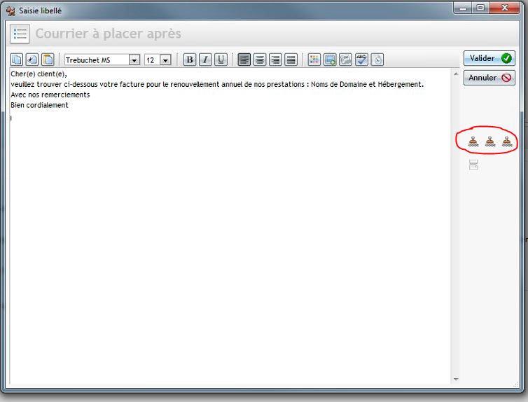 Ce que je cherche à modifier c'est notamment les courriers préenregistrés placés [b]après[/b] les factures et que l'on sélectionne avec les tampons, comme sur l'image ci-dessous (entourés en rouge):